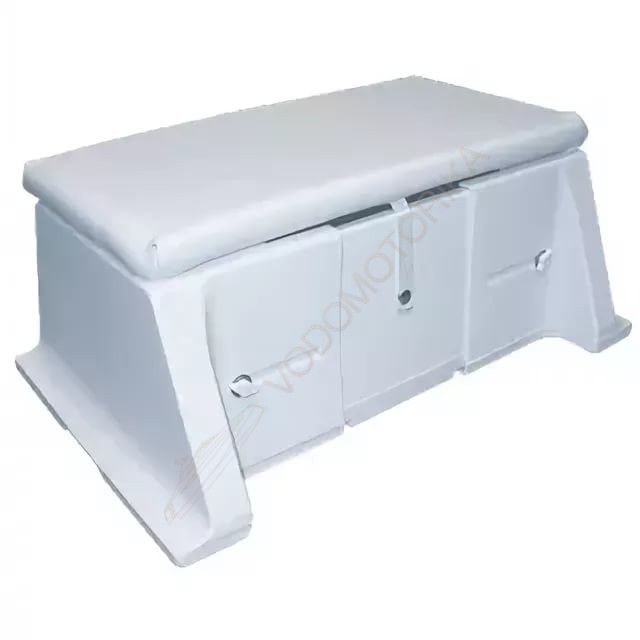 Пластиковое сиденье раздвижной конструкции. Откидывающаяся крышка с мягкой виниловой подушкой. Очень удобно для установки в надувной лодке – отформовки в нижней части сиденья позволяют надежно зафиксировать его надувными бортами лодки (накачайте лодку так, чтобы она приняла объемный вид, установите сиденье, отрегулируйте его ширину и зафиксируйте крепежные винты, докачайте лодку до рабочего давления). Рундук может использоваться для хранения вещей, а также как место для размещения топливного бака.