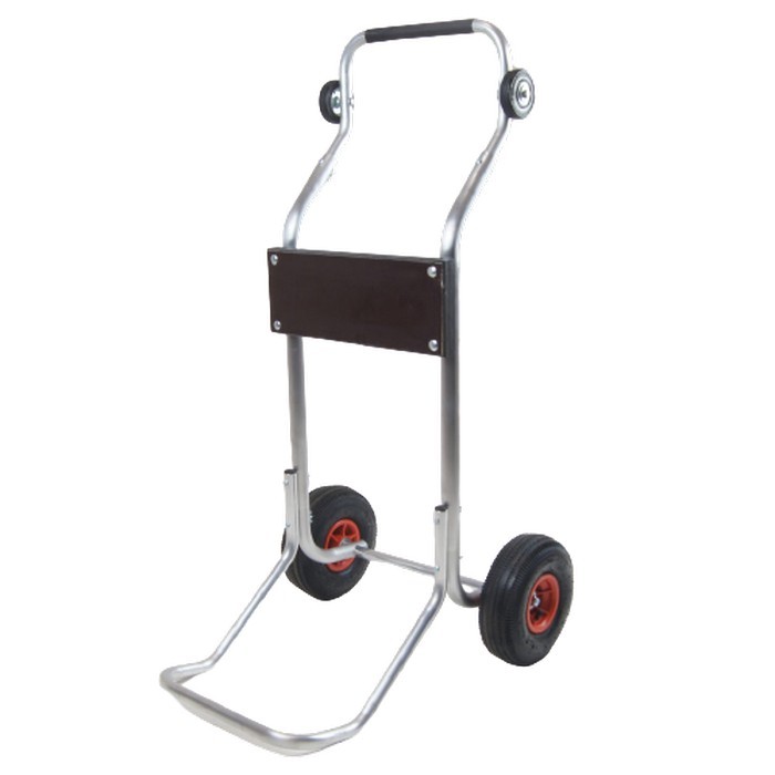 Тележка представляет собой разборную рамную конструкцию. Она может быть легко собрана без применения инструмента. Изделие изготовлено из труб алюминиево-магниевого сплава. Такой метал является очень прочным, несмотря на легкий вес. Все части тележки устойчивы к коррозии. Транец выполнен из морской фанеры и также устойчив к влаге.