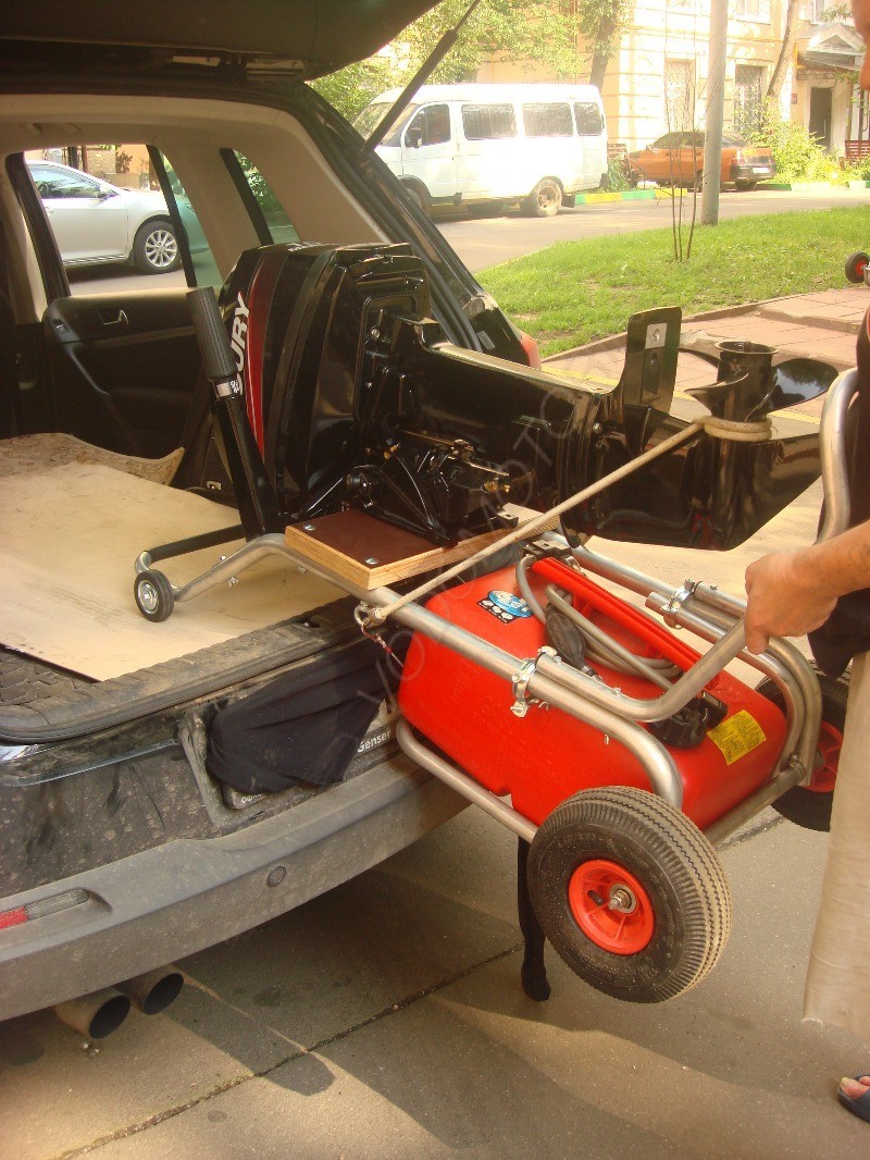 - колеса на ручке (диаметром 85 мм) для легкой погрузки в автомобиль тележки с мотором и топливной емкостью.