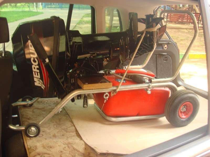 Багажник свободно откидывается и позволяет удобно снимать топливную емкость при закрепленном на тележке лодочном моторе.