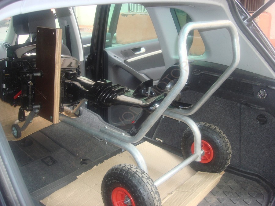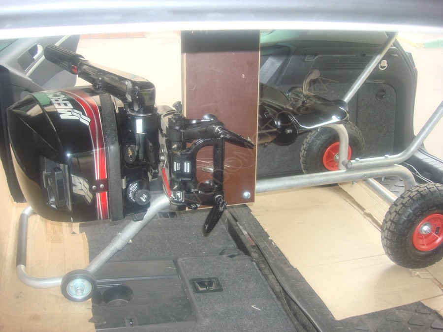 - Транцевая доска на тележке свободно устанавливается пользователем как фронтально (для удобства хранения мотора), так и с левого или правого бока тележки для транспортировки мотора в автомобиле в зависимости от требований к транспортировке указанных в инструкции по эксплуатации 4-х тактного мотора. Боковое крепление транцевой доски усилено кронштейном из алюминиевого уголка толщиной не менее 5 мм. Усиление надежно защищает от вибрации и бокового раскачивания мотора при его транспортировке в автомобиле. Кронштейн имеет универсальное крепление при расположении транцевой доски, как с левого, так и с правого бока тележки. А при фронтовом расположении транцевой доски кронштейн закрепляется с тыльной стороны тележки и не мешает креплению мотора;