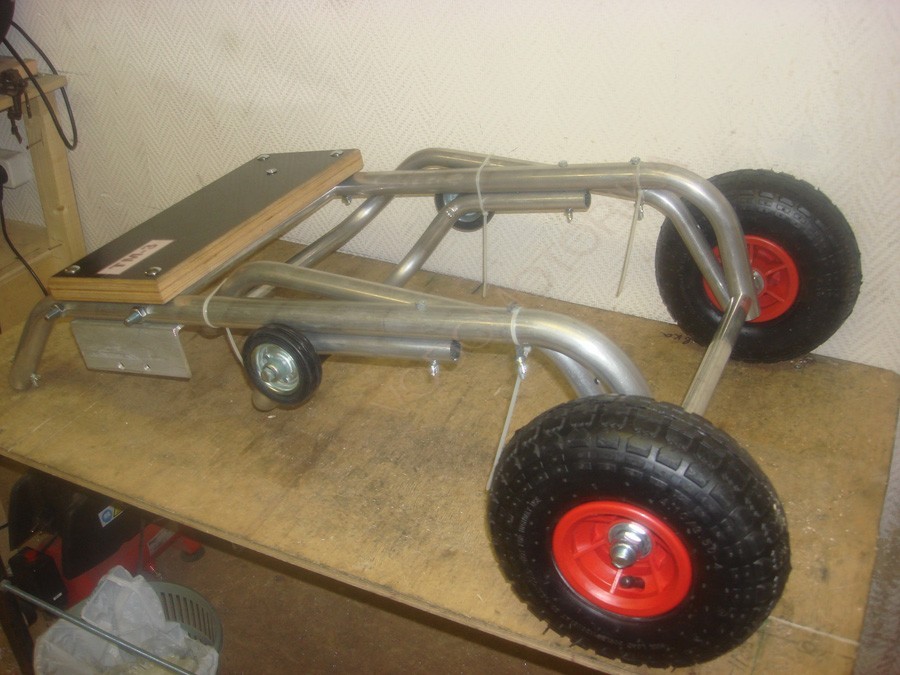 Тележка целиком выполнена из легкого, но прочного алюминиево-магниевого сплава, а крепеж имеет качественное оцинкованное покрытие. Дополнительной покраски не требуется. Прочность тележки обеспечивается рамной конструкцией базирующейся на толстостенных (3 мм) АМГ трубах диаметром 32 мм.