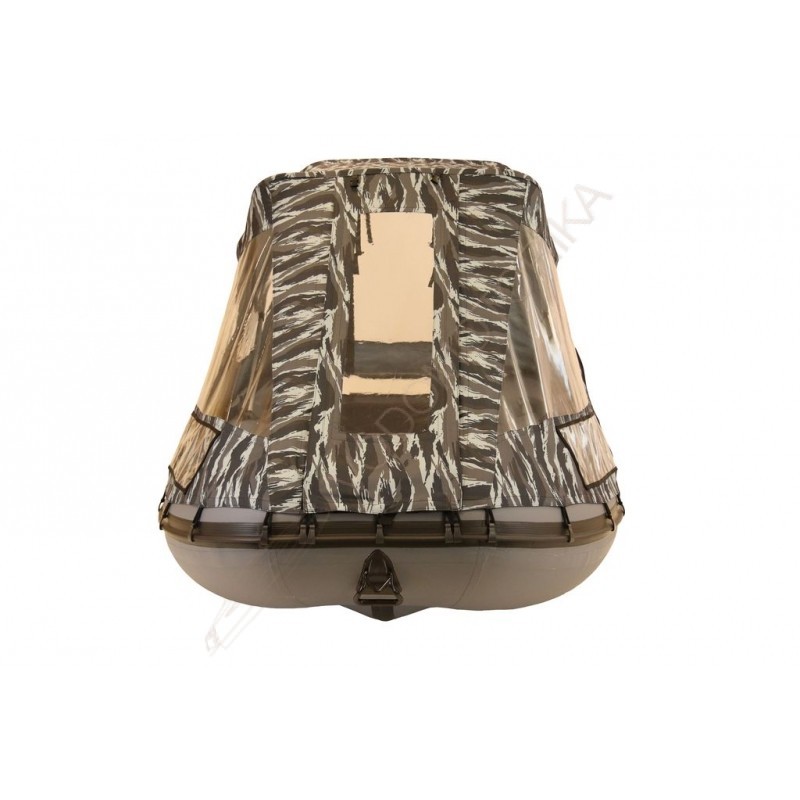 Конструкция ходового тента состоит из прочного металлического каркаса и очень быстро трансформируется до 8 различных положений: легко открывается со всех сторон, при помощи широких смотровых ПВХ - стекол на молниях, позволяя при этом продолжать заниматься любимым делом – будь то рыбалка или охота.
