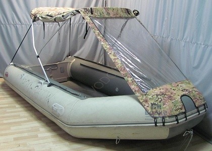 Тент-трансформер – это специальная конструкция с жестким металлическим каркасом, который надежно крепится к самой лодке. Сверху на каркасе закрепляется сам тент, пошитый из прочной и влагостойкой ткани. Снизу тент крепится к лодке, чтобы надежно закрыть все пространство внутри себя от внешнего влияния.